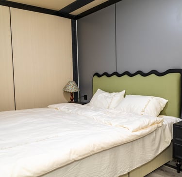 This unit expands to an astonishingly spacious living space, equipped with a kitchenette, bathroom, living area, and bedroom.