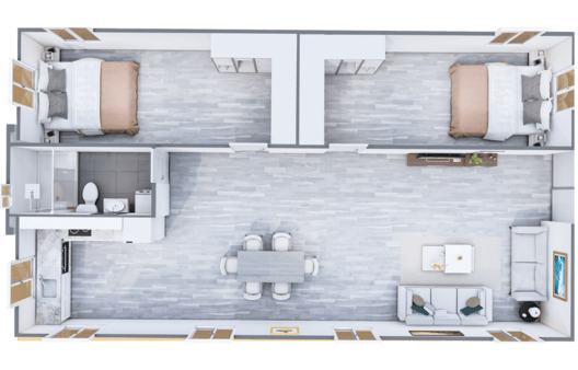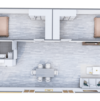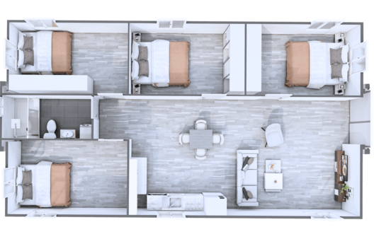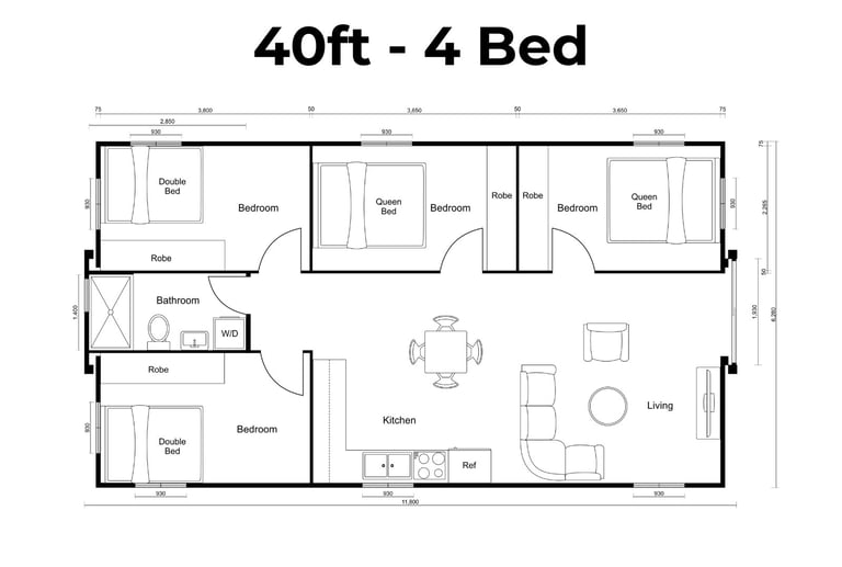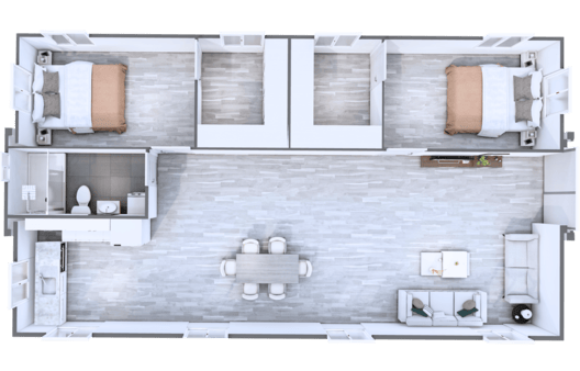 The floor plans of our Container house offer a comfortable and relaxed living experience while maximising the use of space and natural light. We have 4 unique floor plan options with 1, 2,3, and 4 bedrooms, living space, kitchenette, and bathroom with shower +toilet.