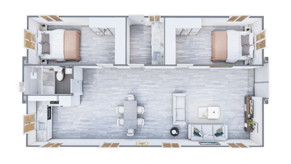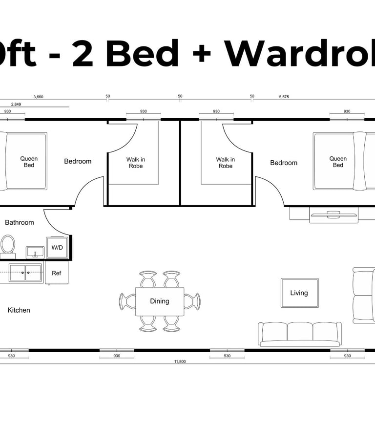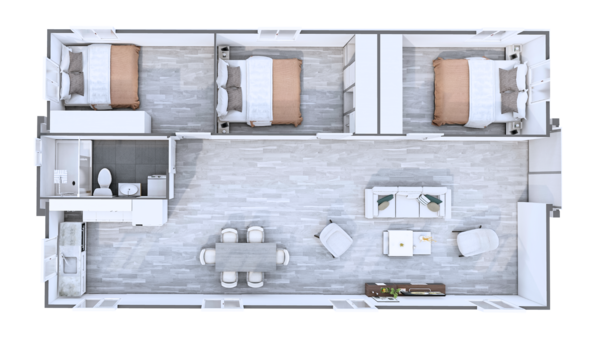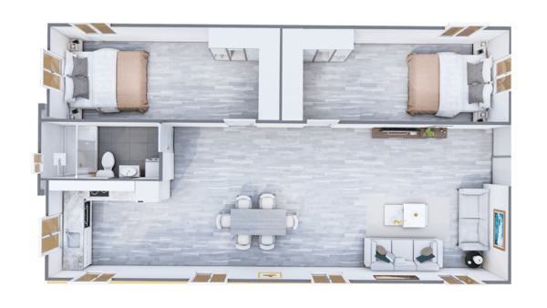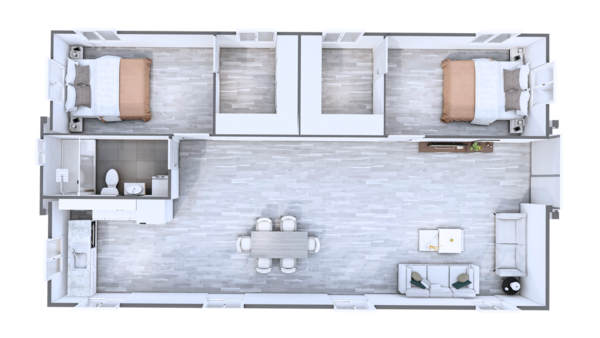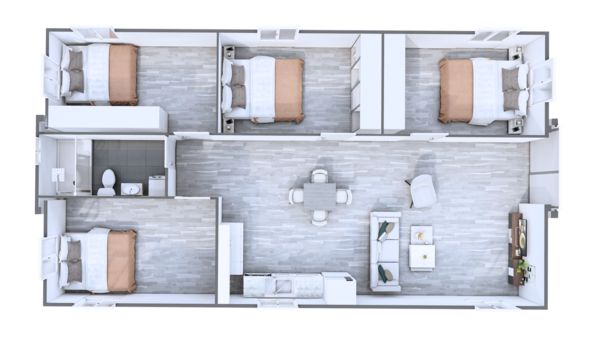 The floor plans of our Container house offer a comfortable and relaxed living experience while maximising the use of space and natural light. We have 4 unique floor plan options with 1, 2,3, and 4 bedrooms, living space, kitchenette, and bathroom with shower +toilet.